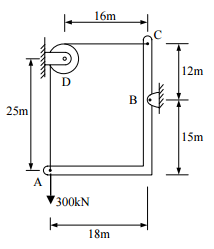 【已刪除】三、圖中 ABC 為剛性構件(rigid member),B 點為鉸支(hinge),D 點為無摩擦之滾 輪(pulley),繩索 ADC 為不可拉伸。已知滾輪半徑為 2 m,試計算繩索 ADC 之 張力與 B 點之反力(reaction)。(25 分)
