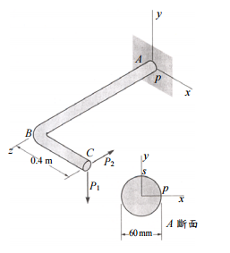 =4 kN,梁斷面為 60 mm直 徑之圓形斷面,AB長 1.3 m,BC長 0.4 m,試求A斷面上p點與s點之最大、最小主應 力及最大剪應力。(25 分)
