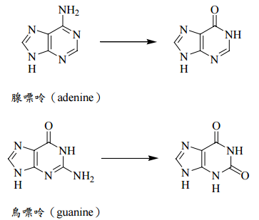 【已刪除】九、腺嘌呤(adenine)與鳥嘌呤(guanine)皆可以水解進行去氨反應 (deamination),請分別寫出水解去氨化的反應機構。(10 分)