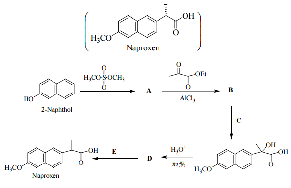 【已刪除】八、下列化合物商品名為 Naproxen(在台之商品名為 Napsin),是目前世界上 使用量最大的消炎止痛劑(Anti-inflammation)之一;請以 2-萘酚 (2-Naphthol)為起始原料設計 Naproxen 之合成,並詳述所需試劑