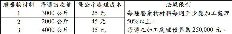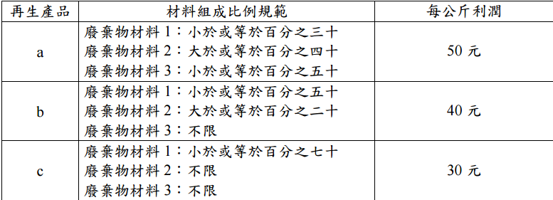 【已刪除】二、某環保機構資源回收 3 大類廢棄物材料(1, 2, 3),並加工處理為 3 種再生產品(a, b, c),不同產品其材料組成比例規範如下表: