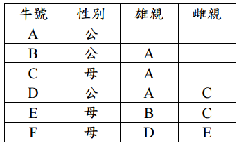 【已刪除】四、今有 6 頭乳牛之雄親(sire)與雌親(dam)系譜資料如下表: