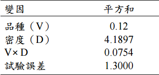 【已刪除】二、某研究人員針對 2 個毛豆推廣品種,在行株距為 45×20、45×15 及 45×10(公分) 的 3 個栽培密度下,田間試驗採用完全隨機設計(CRD),每處理組合重複 4 次, 收穫時調查每小區之產量,並進行變方分析,求得各變因之平方和如下: