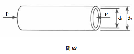 【已刪除】四、有一空心之鋼鐵製圓管受到P的壓力作用如圖四所示,此管內徑d1=8 cm,外徑d2 =10 cm。當P力由零增至 400 kN時,管之外徑成為 10.002126 cm。請計算此時管之 內徑為何?管之厚度為何?管之柏松比(Poisson's ratio)為何?(鋼鐵彈性模數為 200 GPa)(25 分)