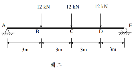 【已刪除】二、如圖二所示,簡支梁 AE 的 EI 為定值,承載三個集中載重,分別在 B、C 及 D 點, 求中點 C 的垂直變位。(25 分)