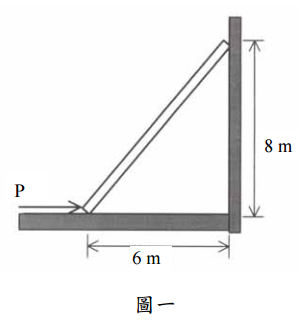 【已刪除】一、如圖一所示,一重量為 200 N 之梯子,其與牆面之摩擦係數為 0.2,與地面之摩擦 係數為 0.3,若欲使梯子向右移動,最小之 P 為何?(25 分)
