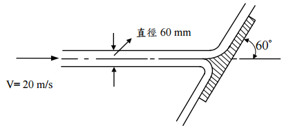 【已刪除】三、如下圖所示,直徑 60 mm 的噴射水流,速度(V)為 20 m/s,被靜止平板的分離裝 置分成兩半。試計算作用於平板上合力的大小與方向。(20 分)