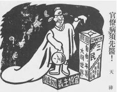 14. 漫畫往往反映出時代的背景,下列這幅漫畫所批判的是: (A)日本殖民統治末期,在臺灣實施的專賣政策優於大陸的三民主義政策 (B)臺灣光復初期,長官公署的官僚主義及專賣政策有違三民主義的原則 (C)國民政府遷臺之初,官僚積習不變且擴大公營事業,遭致黨外的批判 (D)七○年代黨外人士,批評國民黨政府壟斷資源,違反三民主義的精神