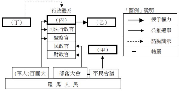 27. 這是「羅馬共和制」的組織結構示意圖,請參照「圖例」說明,辨認各個職位的功能、相應關係及其權力來源。其中丁的職稱應是: (A)獨裁 (B)元老 (C)護民官 (D)執政官