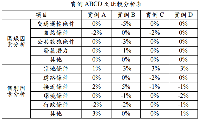 【已刪除】三、試以下列實例說明及比較分析表,挑選適當者推估勘估標的之試算價格及比較價格, 不適用之實例須註明理由:(30 分) 實例 A:為一臨 6 公尺巷道近矩形之不規則形狀基地,地勢平坦,面積 75 平方 公尺,屬勘估標的之鄰近類似住宅區,建蔽率與容積率皆相同;97 年 8 月 1 日之成交價格為 450 萬元,至價格日期漲 3%。 實例 B:為一臨 6 公尺巷道之長方形基地,地勢平坦,面積 250 平方公尺,為重劃 區內之抵費地,屬勘估標的之鄰近類似住宅區,建蔽率 55%,容積率 220%;97 年 3 月 1 日之標脫價格為 1,500 萬元,至價格日期漲 5%。 實例 C:為一臨 8 公尺道路之長方形基地,地勢平坦,面積 80 平方公尺,屬勘估 標的之鄰近類似住宅區,建蔽率與容積率皆相同,98 年 5 月 1 日之擬售 價格為 640 萬元,議價空間 15%,至價格日期未漲。 實例 D:為一臨 6 公尺巷道之長方形基地,地勢平坦,面積 70 平方公尺,屬勘估 標的之鄰近類似住宅區,建蔽率與容積率皆相同;97 年 12 月 1 日之成交 價格為 490 萬元,至價格日期漲 2%。 實例 ABCD 之比較分析表