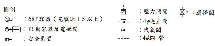 【已刪除】四、某變壓器場所設有全區放射式高壓二氧化碳滅火設備,一共三區每區使用之二氧化 碳各為 10 支、15 支、25 支,為節約成本共用鋼瓶組,並設選擇閥及啟動容器,試 繪出其系統圖並說明操作流程及打開之鋼瓶數、相關安全作用等。繪圖之各圖例如 下:(25 分)