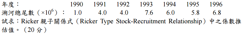 【已刪除】三、白令海生命期為 2 年(亦即:2 歲成魚將溯河產卵)之某種鮭魚系群資源,今有該 魚種之年度溯河總尾數觀測資料壹批如下: