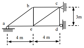 【已刪除】一、如圖所示之桁架(truss)結構,其支承點 a 與 d 為滾支承(roller),支承點 c 則為 鉸支承(hinge)。若已知支承點 a 向下沈陷 0.1 m,試計算各支承點之反力。假設各 構件之 E 值(彈性模數)與 A 值(斷面積)皆為常數,且 AE = 10