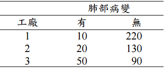 【已刪除】五、調查三個生產石綿相關產品工廠的工人肺部病變數據如下: