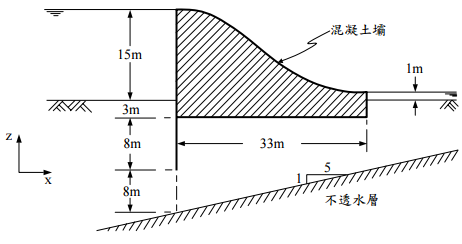【已刪除】一、試繪製圖中混凝土壩下方異向性土壤流線網。若圖中之土壤滲透係數k