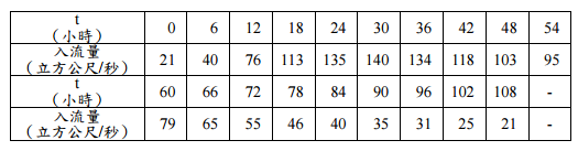 【已刪除】五、某一場暴雨降於集水區面積為 10.0 平方公里,其雨量與流量之紀錄如下表,試計算 其入滲指數 Φ。假設基流量為定值 5 立方公尺/秒。(20 分)