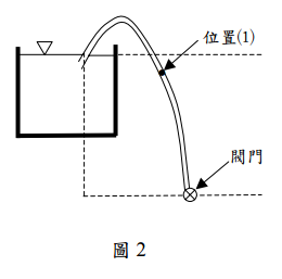 【已刪除】二、利用 Bernoulli 方程式分析圖 2 所示的虹吸現象。考慮虹吸管下方閥門開放和關閉兩種 情形,於圖中標示能量線(EL, energy line)和水力坡線(HGL, hydraulic grade line), 並討論圖中位置的破洞,在閥門開放和關閉時,會有水噴出或空氣滲入現象。請 仿照圖 2 所示於答案紙上繪圖作答。(25 分)