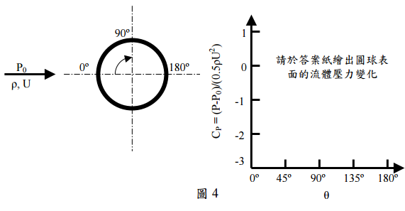 ),繪圖說明圓球表面的流體壓力變化,並比較三種狀 態的阻力(drag)大小。最後請解釋高爾夫球表面為何需要許多凹洞?請仿照圖 4 所示的座標圖於答案紙上繪圖作答。(25 分)