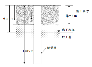 ,黏土有效摩擦角φ'=30°,此黏土尚未壓密完成。現植 入一支長度為 15 m之鋼管樁,外徑 400 mm,鋼管厚度 10 mm。此基樁可能會受到 負摩擦力的影響。試問為何會有此負摩擦力?若假設側向土壓力係數等於靜止側向 土壓力係數Ko,土壤與基樁間之摩擦角δ=0.6φ',試計算此基樁會承受多大的負摩 擦力?(25 分)
