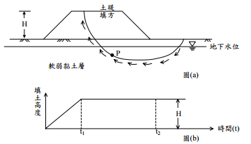 【已刪除】一、如圖(a)所示,擬於軟弱黏土層上構築土堤,構築土堤高度與時間關係如圖(b),試以 軟弱黏土層中之 P 點處為考量重點,分別繪製土堤載重產生之剪應力-時間,基礎土 壤孔隙水壓力-時間,基礎土壤剪力強度-時間,以及土堤邊坡安全係數-時間等四種 關係圖,並說明何時為最危險階段。(25 分)