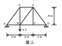 【已刪除】三、圖三之平面桁架系統,所有桁架桿件 EA 均相同,A、D 為鉸支承,B 點承受 6 T 垂 直載重,試求所有桁架桿件內力。(25 分)