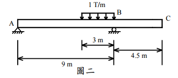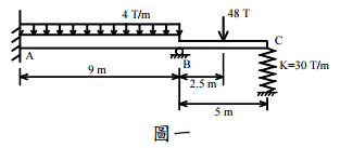 【已刪除】一、圖一之平面梁構架系統,AB桿件長 9 m,承受 4 T/m均佈垂直載重,EI值為 720 T-m