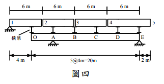 【已刪除】四、圖四之平面梁構架系統,若載重由上方縱梁(1~5)通過,試求經由橫梁傳至下方 主梁(O~E)A點垂直反力R