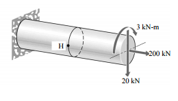 【已刪除】二、如圖所示之左端為固定的圓軸,直徑為 10 cm,承受 3 kN-m 之扭矩,200 kN 之軸向 拉力,與 20 kN 之垂向負載。試求其在距離右側自由端 60 cm 之圓軸表面 H 點處的 主應力(Principal stresses)與最大剪應力(Maximum shearing stress)。(20 分)