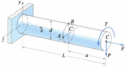 【已刪除】一、如下圖所示承受負荷之圓形截面懸臂樑,試求最大容許的負荷 P 為何?(25 分) d = 60 mm,F = 10P N,T = 0.1P N,容許之拉伸應力為 100 MPa,距離自由端 a = 120 mm 處截面容許的剪應力為 60 MPa。
