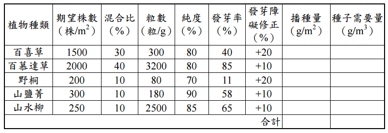 【已刪除】五、噴植方法係以目的種子加噴植材料成為混合基材,噴植於坡面,以達到植生之目的。 其混合種子之播種量,需經多項參數計算而決定之。請依下表所提供之資料計算若 選擇肥沃地施工,噴植厚度 7 公分,噴植損耗 18%時每平方公尺之播種量及每立方 公尺種子之需要量為何?(20 分)