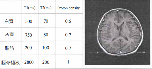 39 在磁振影像中,四個生理組織的參數如下表,則所附影像的取影參數可能為何?