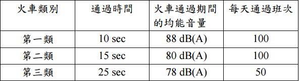 【已刪除】五、某住宅預定地旁正好有鐵路通過,該鐵路行駛三種火車,在該地點量測火車通過時 的噪音,得到下表資料,請計算該處火車通過所產生的 24 小時均能音量(Leq)為 多少 dB(A)?(20 分)