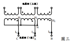 【已刪除】三、圖三所示為三個單相雙繞組變壓器,其高壓側繞組連接成 Y 接。試將圖三的低壓側繞組連 接 成△ 接,且使得高壓側的相電壓領先低壓側等效 Y 接相電壓90