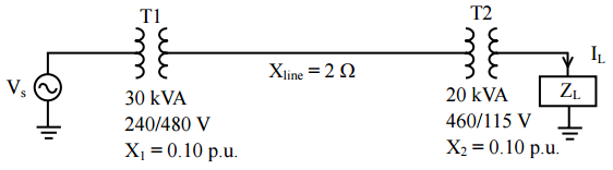 = 220∠0°V,且選用變壓器T1 一次側電壓 240 V及 30 kVA作為基底值(base value),試繪出其以標么值(per unit value)表 示之單線圖,並求出通過Z