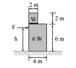 二、下圖為一質量塊組,其兩組成部分的質量分別為 W 與 6 W。若地面與質量塊間的摩 擦係數為 0.4,今有一力 F 作用於質量塊左側,請問當質量塊產生滑動而不傾倒, 作用力的最大施力高度 h 值為多少?(20 分)