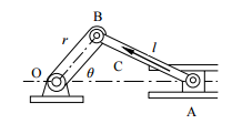 五、在下圖中所示為一滑動曲柄,連桿 AB 受到壓力 C 的作用。試以圖示的符號 C、r、 l、θ 推導作用力 C 對於曲柄軸 O 的力矩。(20 分)