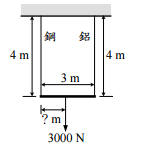 三、下圖所示的均質水平橫桿長度為 3 m,兩端分別以長度 4 m 的鋼索與鋁索繫之。若 鋼的彈性係數 E