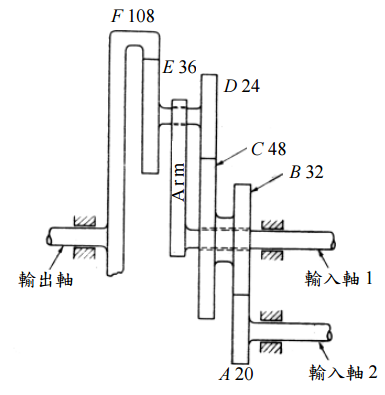 三、如圖所示之齒輪系,設輸入軸 1 之轉速為 120 r.p.m.(逆時針方向),而輸入軸 2 之 轉速為 360 r.p.m.(順時針方向),試求輸出軸之轉速及方向。(20 分)