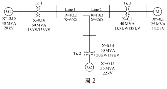 【已刪除】四、如圖 2 所示之電力系統,圖中標示之每一元件阻抗標么值(p.u.)係由其電壓、電 流與 MVA 基準值決定。試以輸電線之 138 kV,100 MVA 做基準,假設此系統在無 載的情況,畫出以標么值表示之系統阻抗圖。(20 分)