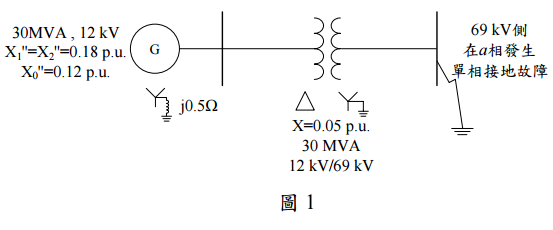 【已刪除】二、一部 30 MVA,12 kV 之發電機聯結至一部 Delta-Ground Wye(Δ-Y grounded)接法 之變壓器,形成一獨立之電力系統,如圖 1 所示,其中各阻抗係由元件之基準值求 得,如圖 1 中標示。若有單相接地(故障接地阻抗為零)故障於變壓器 69 kV 側之 a 相發生,試求故障時,發電機側的 a、b 及 c 相電流,請以安培表示。假設故障前, 變壓器 69 kV 側 a 相電壓具有零度的相角。(20 分)