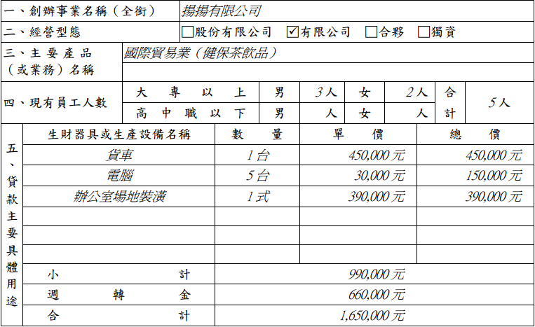以下的表格是由業務單位就編號 17 的「創辦事業資料」資料流,提供申請民眾需 填寫的表格範例:
