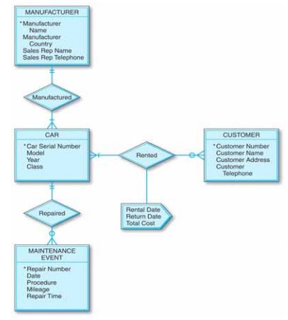 五、請將租車公司 ER 圖(Entity-Relationship Diagram)(如圖所示)轉換成為關聯表格。 製造商(MANUFACTURER)表格共有 4 個欄位(Manufacturer Name, Manufacturer Country, Sales Rep Name, Sales Rep Telephone)。汽車(CAR)表格共有 4 個欄位 (Car Serial Number, Model, Year, Class)。維修事件(MAINTENANCE EVENT) 表格共有 5 個欄位(Repair Number, Date, Procedure, Mileage, Repair Time)。客戶 (CUSTOMER)表格共有 4 個欄位(Customer Number, Customer Name, Customer Address, Customer Telephone)。其中客戶租車必須記錄 3 個欄位(Rental Date, Return Date, Total Cost)資料。(20 分)