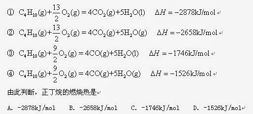 7. 下面均是正丁烷与氧气反应的热化学方程式(25℃,101kPa): ① ② ③ ④ 由此判断,正丁烷的燃烧热是 (A) -2878kJ/mol (B) -2658kJ/mol (C) -1746kJ/mol (D) -1526kJ/mol