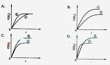 9. 相同体积、相同pH的某一元强酸溶液①和某一元中强酸溶液②分别与足量的锌粉发生反应,下列关于氢气体积(V)随时间(t)变化的示意图正确的是