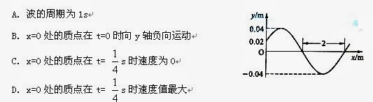 15. 一简谐横波以4m/s的波速沿x轴正方向传播。已知t=0时的波形如图所示,则 (A)波的周期为1s (B)x=0处的质点在t=0时向y轴负向运动 (C)x=0处的质点在t= s时速度为0 (D)x=0处的质点在t= s时速度值最大