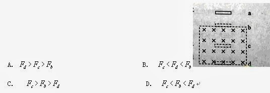 18. 如图,空间某区域中有一匀强磁场,磁感应强度方向水平,且垂直于纸面向里,磁场上边界b 和下边界d水平。在竖直面内有一矩形金属统一加线圈,线圈上下边的距离很短,下边水平。线圈从水平面a开始下落。已知磁场上下边界之间的距离大于水平面a、b之间的距离。若线圈下边刚通过水平面b、c(位于磁场中)和d时,线圈所受到的磁场力的大小分别为、和,则 (A)>> (B) << (C) >> (D) <<