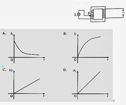 19. 图中为一理想变压器,其原线圈与一电压有效值不变的交流电源相连:P为滑动头。现令 P从均匀密绕的副线圈最底端开始,沿副线圈匀速上滑,直至白炽灯L两端的电压等于其额定电压为止。用表示流过原线圈的电流,表示流过灯泡的电流,表示灯泡两端的电压,表示灯泡消耗的电功率(这里的电流、电压均指有效值:电功率指平均值)。下列4个图中,能够正确反映相应物理量的变化趋势的是