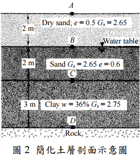 【已刪除】四、有一工址,土壤剖面如圖 2 所示,e:孔隙比,Gs:土壤顆粒之比重,w:含水量, AB之間為完全乾砂,試求土壤中B、C、D 三點的總應力、孔隙水壓力及有效應力。 (15 分)當地下水位下降至C位置時,此時BC之間的砂土飽和度為 50%,試求此時 B、C、D 三點的總應力、孔隙水壓力及有效應力。(10 分)