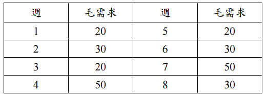 【已刪除】四、一品項 A,整備成本為$100,每單位每週的持有成本為$0.5,請針對下表所提供之 物料需求計畫(MRP)中所得到之該品項的毛需求,分別使用批對批(lot-for-lot, L4L)、經濟訂購量(economic order quantity, EOQ)和最小總成本(least total cost, LTC)法,計算該品項在此計畫中應有之批量和相關的總成本。(註:此規劃期 結束時,若仍有預計存貨繼續持有,則該繼續持有之存貨持有成本應在下一規劃期 考慮)。 (25 分)