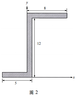 【已刪除】二、圖 2 所示之形狀中,各肢的寬度同為 1 cm,其餘長度尺寸如圖示(所標示尺寸之單 位為 cm),求對 x 軸及 y 軸之面積二次矩。(25 分)